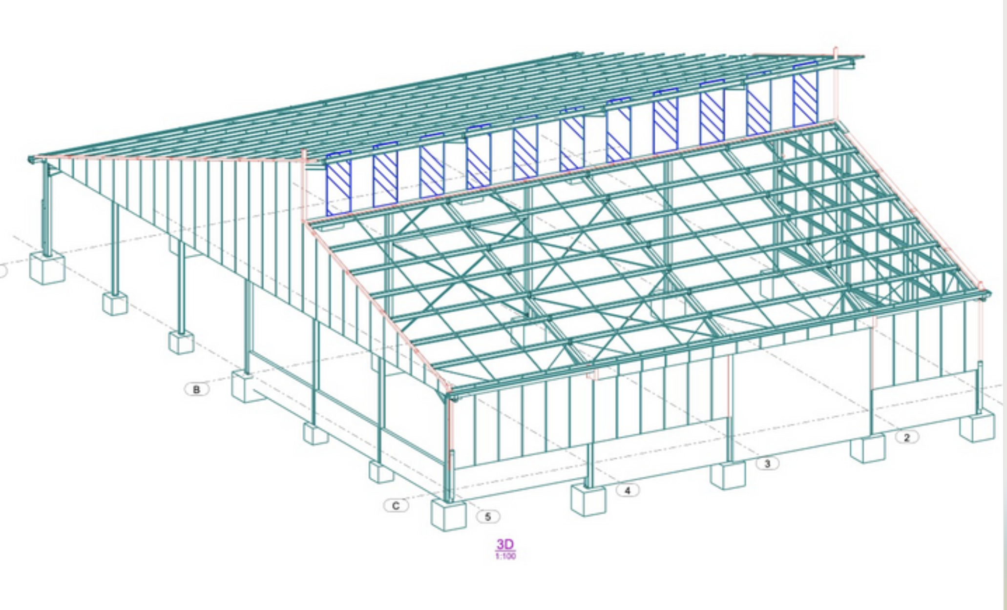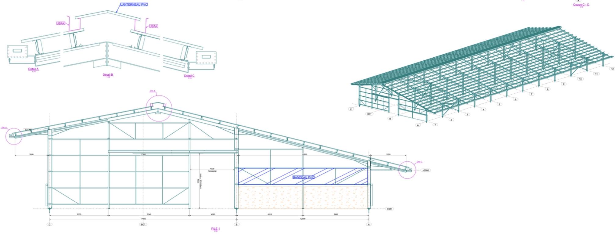 • Élaboration de plans d’ensemble de charpente pour visualiser la structure complète du bâtiment agricole.